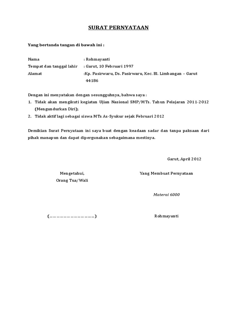 Contoh surat pernyataan yang baik dan benar terlengkap. Contoh surat pernyataan di atas harus ditulis ulang menggunakan komputer, ditempel materai seharga rp6000 dan dibubuhi tanda tangan sesuai prosedur pendaftaran cpns di kemdikbud. Ada yang pernyataan diri sendiri, orang tua, desa, pembimbing, dan lainnya. Adapun jenis surat seperti ini di antaranya surat pernyataan diri, hutang, kesanggupan, kerja kemudian, surat pernyataan kelakuan baik, permohonan maaf, belum menikah, sekolah hingga sebagai contoh, saat melamar sebuah pekerjaan, seseorang akan membuat surat macam ini. Contoh surat pernyataan diri dan tips membuatnya dengan baik, surat pernyataan diri kesehatan, menikah, menjual barang, surat peryataan diri hukum, kriminal dan masih banyak lagi akan admin bahas kali ini.