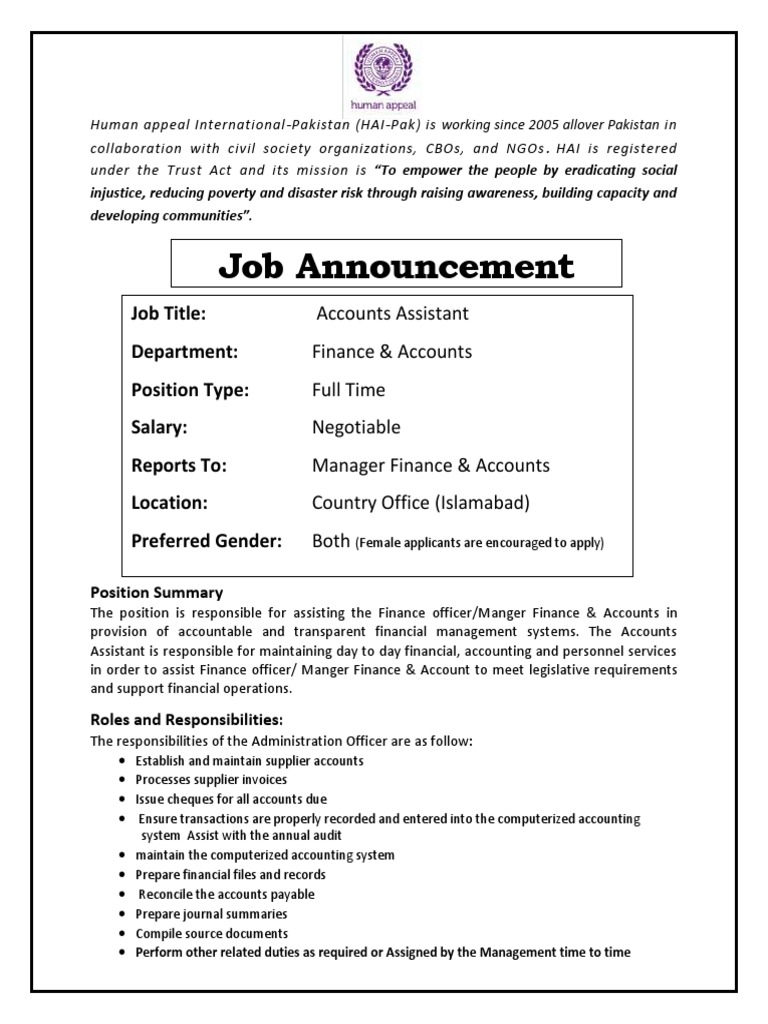 Support the finance manager in recording and retrieving financial details of the company (turner contemporary enterprises limited), including maintaining financial records, processing payments, cash handling and salaries. Search and apply for the latest ngo finance jobs. The finance assistant provides support to the finance and administration manager in maintaining an effective and efficient finance and at least three years' experience, preferably in a national or international ngo. Finance jobs in ngo, pakistan 2020 are available at jobz.pk. Their duties include assisting with tasks like managing records and organizing reports. The finance assistants will report to the finance manager. Latest finance vacancies in ngo city from all todays newspapers can be seen here online. Looking for more job opportunities? Find the best offers for job description finance assistant among 662 job vacancies listed. Enter your email address to receive alerts when we have new listings available for job description finance assistant. Job descriptions » finance » financial assistant job description. We're looking for a diligent accountant to keep our books and records on track with unwavering accur. Accountant job description, free pdf sample: